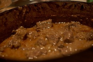 Add the meat to the onions and stir occasionally. Cook till the meat is tender and flakes off slightly.