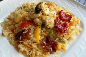 6. When rice is tender, add golden brown onion and green leaves of coriander on rice.